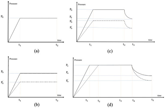 An ideal gas is generated and released into a closed chamber. The partial pressure of the gas pressure is shown in Figure 3a, which increases slowly and then reaches equilibrium. Because water vapor has a certain adsorption property in the inside metal material of the tube, the actual partial pressure, , of the water vapor is lower than the theoretical partial pressure, P0, as shown in Figure 3b. Because the saturated vapor pressure of water is low at room temperature (based on the current thermal design of the entire Lunar Soil Volatile Measuring instrument on Chang’e-7, the on-orbit analysis temperature is close to room temperature), it is easy to reach saturation. Therefore, when the water content is high, the water needs to be analyzed after partial discharge. In order to avoid confusion between air pressure and saturated vapor pressure during measurement, the partial pressure of the water vapor under analysis needs to be much lower than the saturated vapor pressure at the current temperature. If all the water is released from the heating, after internal absorption the partial pressure of the final water vapor does not reach the saturation vapor pressure of the current temperature, but it is too high to the threshold set by the drainage; the process of the partial pressure of the water vapor from heating to measure is shown in Figure 3c. The process of the partial pressure of the water vapor from heating to measure if the partial pressure of the final water vapor does reach the saturation vapor pressure of the current temperature is shown in Figure 3d.