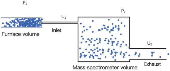 The following is a detailed description of the volatile measurement process. Because the partial pressure of the water vapor released via heating is too high, the chemical analysis using the mass spectrometer cannot directly be conducted. A method is needed to dilute the pressure of the sample being analyzed in equal proportions. Therefore, a flow conductivity dilution method is adopted. The partial pressure of the measured gas in the furnace and pipeline is defined as P1, and these gases are introduced into the mass spectrometer through a flow-limiting hole, and the partial pressure of this gas in the mass spectrometer chamber is defined as P2, as shown in Figure 4. In addition, the inlet flow conductance of the mass spectrometer is defined as U1, and the exhaust flow conductance is U2. Moreover, the lunar surface environment is assumed to be an absolute vacuum. Because the exhaust volume is less than the inlet volume in the process of air pressure equilibrium between the two, it can be approximated that the partial pressure P1 is unchanged.