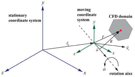 The CFD software ANSYS Fluent 2021 was adopted to perform the numerical simulations. The MRF method is used to simulate the fan rotation. The MRF model is a steady-state approximation in which individual cell zones can be assigned different rotational and/or translational speeds [31]. Consider a coordinate system that is translating with a linear velocity and rotating with angular velocity relative to a stationary reference frame, as illustrated in Figure 4. The origin of the moving system is located by a position vector . The computational domain for the CFD problem is defined with respect to the moving frame such that an arbitrary point in the CFD domain is located by a position vector from the origin of the moving frame.