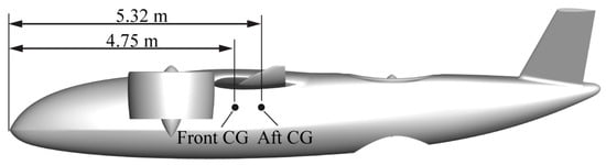 In this section, the flowfield of the VTOL aircraft introduced in Section 2 hovering at different heights were simulated using the numerical method established above. The height h is also defined as the vertical distance from the front duct exit to the ground plane. It should be noted that the reference of h in this section is the blade diameter D of the front ducted fan. Considering the space occupied by the landing gear, the minimum h in the simulations was set to 0.75D. Other simulations were performed in the height range of 1D−4D with an interval of 0.5D. The meshes used in this section were generated according to the medium mesh in Section 3, and the cell number of the h/D = 1 case is about 23 million. The mesh on the aircraft surface and some mesh details of the ducted fan are shown in Figure 7. Except that the intersection of the aft fan rotation domain and the symmetry plane was set to periodic boundaries, as shown in Figure 8, other boundary conditions and solution settings were the same as in Section 3. At each height, two sets of fan rotational speed settings were simulated. In the first set, the fan rotational speed of the front ducted fan was 1470 rpm and that of the aft ducted fan was 1680 rpm. In the second set, the fan rotational speed of the front ducted fan was 1345 rpm and that of the aft ducted fan was 1995 rpm. These two sets of fan rotational speeds make the total lift out of ground effect close to the maximum takeoff weight of the aircraft. The first set of the fan rotational speeds makes the pitching moment with the front center of gravity (CG) as the reference point zero, hereafter referred to as the front CG case; the second set of the fan rotational speeds makes the pitching moment with the aft CG as the reference point zero, hereafter referred to as the aft CG case. The front and aft CG positions are shown in Figure 9. The performances of the front ducted fan, the aft ducted fan, and the aircraft out-of-ground effect (OGE) are shown in Table 2, Table 3, and Table 4, respectively. The variables T, P, PL, L are thrust, shaft power, power loading, and lift, respectively, where PL = T/P. Variables with the subscript OGE indicate the corresponding values obtained from simulations out of ground effect. For the OGE simulations, the bottom surface of the computational domain is a farfield boundary instead of a ground wall boundary, and the distance from the front duct exit plane to the bottom farfield boundary is about 40D.