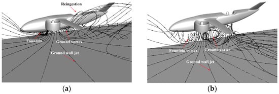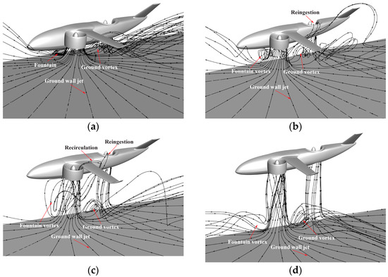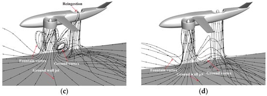 In addition to the above-mentioned main flow features, the presence of the ground also affects the flow induced by the entrainment of the ducted fans. Taking the local flow around the wing of the front CG case as an example, as shown in Figure 15, it can be seen that the streamlines flowing toward the wing are closer to the vertical direction when the aircraft approaches the ground.