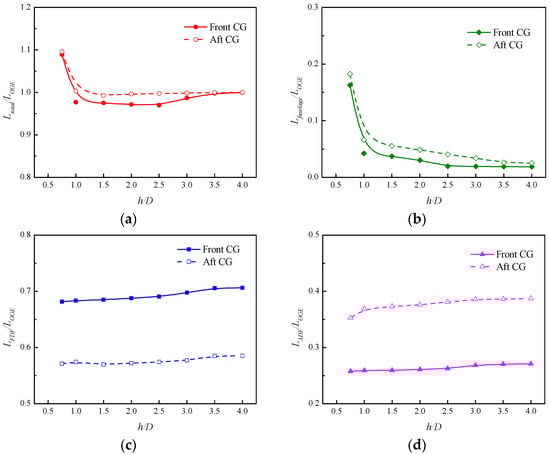 Figure 16 shows the variation of the lift with heights, where the lift is normalized by the LOGE. In Figure 16, Ltotal, Lfuselage, LFDF, and LADF are total lift, fuselage lift, front ducted fan lift, and aft ducted fan lift, respectively. In the hovering case, the lift of the ducted fans is identical to their thrust. The wing and V-tail lift to the total lift ratio is less than 1% and they are not plotted in the figure. The change of the total lift is mainly affected by the change of the ducted fan thrust and the change of the fuselage lift. As the height decreases, the thrust of the ducted fans decreases and the fuselage lift increases. As a result, the minimum value of the total lift of the front CG case occurs at 2.5D, which is 3.0% less than that out of ground effect; the minimum value of the total lift of the aft CG case occurs at 1.5D, which is 0.8% less than that out of ground effect. In the height range of 1D–4D, the lift variation of the aft CG case is more moderate. At 0.75D, the total lift increases significantly due to a significant increase in the fuselage lift. At this height, compared with the cases out of ground effect, the total lift of the front CG case increases by 8.9% and the total lift of the aft CG case increases by 9.6%. It is worth mentioning that when the height is less than 1.5D, the entrainment of the ground vortex under the wing, as can be seen in Figure 15, induces a download, but its magnitude is small about 0.2% LOGE.