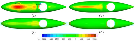 Pressure contour on lower surface of fuselage at different heights of front CG case: (a) h/D = 0.75; (b) h/D = 1.0; (c) h/D = 1.5; (d) OGE.