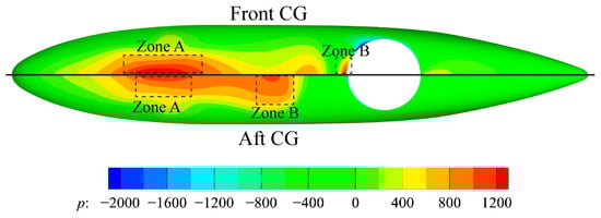 The trend of the fuselage lift at different heights of the aft CG case is similar to that of the front CG case. The fuselage lift increases from 2.5% LOGE out of ground effect to 18.3% LOGE at 0.75D. In the aft CG case, the jet strength of the front ducted fan is weakened because of the thrust reduction. Consequently, the high-pressure area and the pressure peak caused by the fountain impact decreases, as can be seen in Zone A in Figure 19 and Figure 20. However, the jet strength of the aft ducted fan intensifies because of the increased thrust. The impact area of the upwash, Zone B in Figure 19, caused by the ground vortex increases. As a result, the fuselage lift increases compared with the front CG case. At 0.75D, the fuselage lift increment of the aft CG case is 8.4% larger than that of the front CG case, and the total lift increment of the aft CG case is 7.2% larger than that of the front CG case.