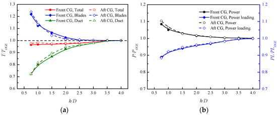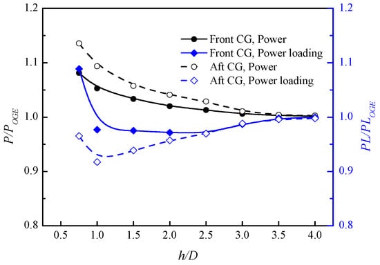 - At a specific fan rotational speed, the power consumption of the front and aft ducted fans increases as the height decreases. Compared with the out-of-ground effect, the power loading of the aircraft in the ground effect generally shows a decreasing trend, and the hovering efficiency decreases. This is mainly due to the decrease in the thrust of the ducted fans in ground effect.