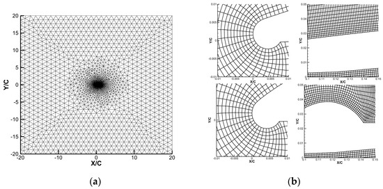 For the boundary conditions, the left boundary of the rectangular far-field is set as a velocity inlet, the right boundary is a pressure outlet, and the lower side boundary is also a velocity inlet. The boundary condition for the upper side depends on the flow direction at different angles of attack. Specifically, when the angle of attack is 0°, the upper side boundary condition is set as a velocity inlet. However, for positive angles of attack, the fluid exits the domain, and thus the upper side boundary condition is set as a pressure outlet [16,37].