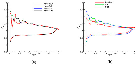 Figure 4 illustrates the comparison of airfoil surface pressure using different boundary layer scales and turbulence models. In Figure 4a, the results demonstrate consistency across the first layer heights of the appendage layer (y+ = 1.0, 0.10, and 0.01), indicating that the grid has minimal impact on improving computational accuracy. Consequently, a first layer height of y+ = 1.0 is adopted for the boundary layer grid in all subsequent models presented in this paper because y+ = 1.0 is dense enough to capture the flow characteristics of the flow around rough surface. In [37,38], the S-A and SST turbulence models were utilized to calculate the wing flow fields of pigeons and golden eagles. The comparison results in Figure 4b also confirm that the results obtained using the two turbulence models, S-A and SST, are essentially similar. Considering the slightly lower computational cost of the one-equation S-A model, it was chosen for the subsequent calculations in this study. Furthermore, it is important to note that the flow field remains steady for angle-of-attack values less than 8° and becomes unsteady for angles of attack greater than 8°. In the case of unsteady flow, time-averaged physical parameters are extracted by averaging over a cycle after obtaining converged sinusoidal results. As the reference time scale τ = C/V∞ = 0.1027 s, the unsteady time step is two orders of magnitude smaller, set at 0.001 s. The number of internal iterations is set to 20, and the total simulation time consists of 10,000 steps.