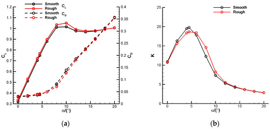 - The aerodynamic efficiency of the rough airfoil is lower than that of the smooth airfoil at angles of attack below 6°, primarily due to the more pronounced increase in drag compared to lift. In the medium angle range of 8°–16°, the rough airfoil demonstrates higher aerodynamic efficiency. However, after 16°, when the flow field is dominated by separated flow, the lift remains almost constant, the drag experiences a slight reduction, and the aerodynamic efficiency does not exhibit significant improvement (less than 1%).
