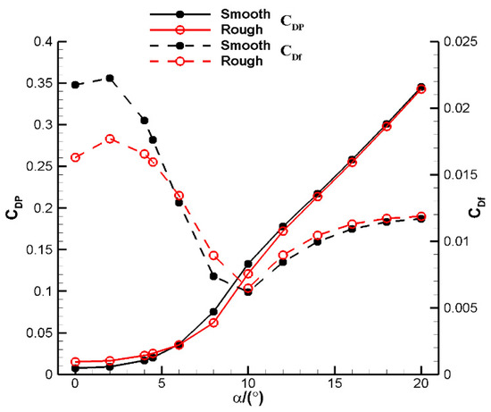 Comparison of pressure drag coefficient CDP and skin drag coefficient CDf.