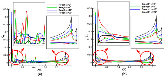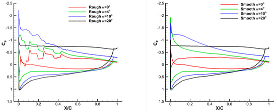 Figure 7 illustrates the comparison of the airfoil surface pressure coefficient CP for four selected angles of attack (0°, 4°, 10°, and 20°). Additionally, Figure 8 presents the distribution of the corresponding friction coefficient Cf on the airfoil surface, while Figure 9 displays the pressure contour and streamlines. The pressure coefficient, Cp, is defined as Cp = (P − P∞)/(0.5ρV∞2), where P represents the local static pressure, and the friction coefficient, Cf, is defined as Cf = τω/(0.5ρV∞2), with τω representing the wall shear stress. Analyzing Figure 7, it becomes evident that the pressure distributions on the lower surface and the second half of the upper surface of both airfoils closely overlap. However, the rough airfoil exhibits noticeable suction peaks at protruding positions, resulting in lower pressure compared to the corresponding positions on the smooth airfoil. Figure 8 reveals that the friction coefficients at these corrugated positions of the rough airfoil are significantly higher due to the irregularities, contrasting with the corresponding positions on the smooth airfoil. When examining the flow field in Figure 9, we observe that the four valleys resemble “stagnant zones” in the flow at 4° and 10°, leading to the formation of standing vortices. Conversely, the flow is accelerated before the four ridges, resulting in reduced pressure. Since lift is generated by the pressure difference between the upper and lower surfaces, the rough airfoil exhibits higher lift compared to the smooth airfoil. At an angle of attack of 20°, the flow field is predominantly characterized by a wide range of separated vortices, minimizing the effect of standing vortices in the valleys and resulting in similar lift for both airfoil types.