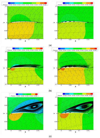 From Figure 10, we observe that the lift curves exhibit a consistent trend across different Reynolds numbers, with the maximum lift occurring around the 10° angle of attack. Beyond 16°, the lift of both airfoils becomes nearly identical. Generally, higher Reynolds numbers correspond to larger lift coefficients. At the 10° angle of attack, the lift coefficient of the rough airfoil increases by 77% and 298% for Re = 2.0 × 104 and Re = 3.0 × 104, respectively, compared to Re = 1.5 × 104. The drag coefficient also experiences a significant increase with increasing Reynolds numbers. Specifically, at the 10° angle of attack, the drag coefficient of the rough airfoil increases by 74% and 282% for Re = 2.0 × 104 and Re = 3.0 × 104, respectively, compared to Re = 1.5 × 104. The trend of the lift-to-drag ratio remains consistent across the three Reynolds number cases, demonstrating that the rough airfoil exhibits superior aerodynamic efficiency to the smooth airfoil in the medium angle range of 8°–16°. When examining the streamlines and pressure distribution in Figure 11 and Figure 12, we observe that the flow field structure remains largely similar across different Reynolds numbers. However, as the Reynolds number increases, resulting in higher freestream velocities, we observe larger maximum pressure and smaller minimum pressure in the flow field. Consequently, the pressure difference and corresponding lift and drag forces also increase.