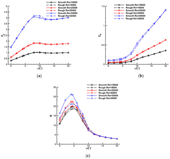 In the previous section, we examined the aerodynamic effects of the rough and equivalent smooth airfoils based on the swift wing at Re = 1.5 × 104. In this section, we extend our investigation to explore the aerodynamic characteristics of these two airfoils at Re = 2.0 × 104 and Re = 3.0 × 104. Figure 10 presents a comparison of the time-averaged lift coefficient CL, drag coefficient CD, and lift-to-drag ratio K for the two models at various angles of attack. Additionally, Figure 11 and Figure 12 showcase the pressure contours and streamlines at selected angles of attack (4°, 10°, and 20°). These visualizations offer valuable insights into the aerodynamic behaviors of the airfoils under different flow conditions.