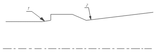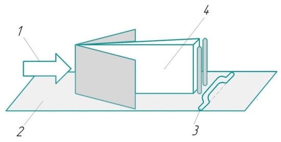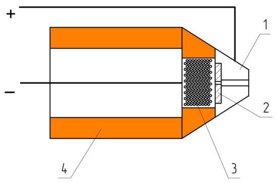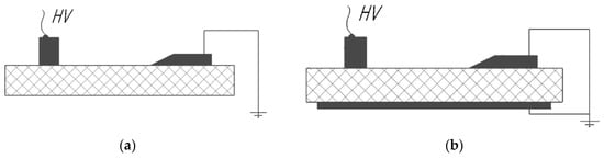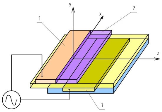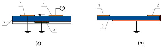 Figure 11 provides a typical diagram of nanosecond surface dielectric «barrier» discharge (Surface Dielectric Barrier Discharge (ns-SDBD)) [49,50,51,52]: Two flat electrodes (a high-voltage electrode (1) are shown above and a low-voltage (grounded) electrode (2) at the bottom in Figure 11) are separated by an interelectrode dielectric insert.