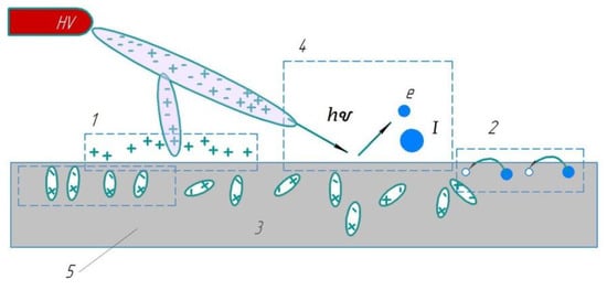 Interaction of streamers with the surface, various mechanisms: 1—through a dustable surface charge, 2—through surface conductivity, 3—through dielectric polarization, 4—through photoemission and thermoemission (in the case of a spark), 5—dielectric.