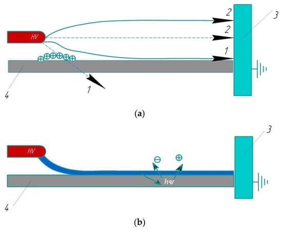 Figure 6 shows a system of electrodes (two typical cases) used to create a pulsed sliding nanosecond surface discharge. When a high-voltage voltage pulse is applied to electrode 4, the dielectric surface 3 exhibits an offset current, which is determined by the voltage value, the steepness of its growth, and the variable capacity between the surface discharge plasma and electrode 2, covering the opposite side of the dielectric. In this case, the sliding surface discharge acts as an ionizer around the first electrode 1, wherein the constant voltage component creates a sliding corona discharge between electrodes 1 and 4.