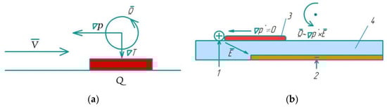 Note that for a gas-plasma flow moving at some speed along a heated surface, see Figure 7a. The pressure gradient is directed against the flow, but the temperature gradient —directed toward the interelectrode insert surface. As follows from the equation for vorticity in the case of «thermal action» the circulation of the vortex is determined by the form (a consequence of the non-collinearity of pressure and temperature gradients). Thus, the «thermal effect» twists the flow counterclockwise [42,43].