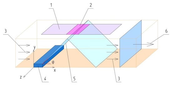 Structure of the plasma gas flow in the discharge chamber with a barrier on the bottom wall: 1—discharge area; 2—research area; 3—flow; 4—obstacle; 5—oblique shock wave; 6—shock wave.