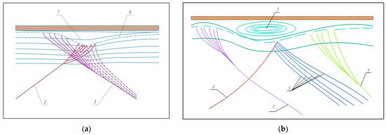 Schemes of interaction of the oblique shock of the seal with the boundary layer: (a) continuous interaction; (b) interaction with the formation of flow separation: 1—subsonic layer (a) or separation area (b); 2—incident shock wave; 3—reflected shock wave; 4—compression waves; 5—rarefaction waves; 6—sound line.