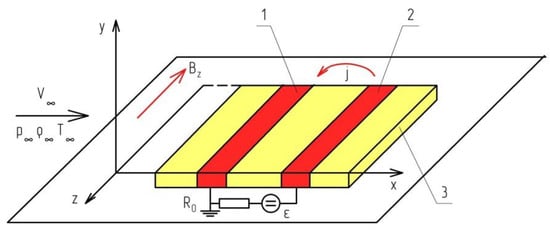 Long studies of complicated physical processes occurring at high altitudes (about 20–30 km) and flight speeds of advanced aircraft (Mach number 6) have led to the emergence of a new scientific direction, which is physical gas dynamics (the subject of study is high-speed and high-temperature gas flows normally accompanied by a great amount of non-linear physical processes). One of the most exciting scientific directions (in physical gas dynamics), which is related to recently discovered methods of AA control, is based on MPA. Magnetoplasma aerodynamics studies the phenomena and processes of interaction between a high-temperature gas flow and electric and magnetic fields. The main advantages of MPA (over gas-jet and mechanical actuators) in the methods of controlling high-speed flows are illustrated in articles [14,15] and the review [11]. As a reminder, a technical device employed in controlling gas-dynamic flows by plasma is a plasma actuator.