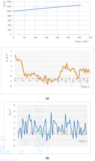 Figure 1a shows the dependence of FO acceleration a(t) on flight time according to algorithm (9). It is clear from the figure that the acceleration of the FO changes due to the turbulence of the atmosphere and the thrust of the engines, and it has a random character.