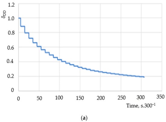 On the basis of algorithms (1)–(25), a simulation of the potential (maximum) accuracy of DME was performed. The simulation results are shown in Figure 2. Figure 2 shows the dependence of the δDD = Kdd . σD −2 is the standardized measurement error of the slant distance D(t) between FO and DME, at time t. Kdd is the a posteriori dispersion of the measurement error of the slant distance D(t) between FO and DME. The following signal and interference parameters have been used in the simulations: