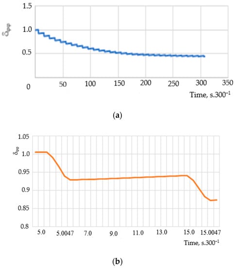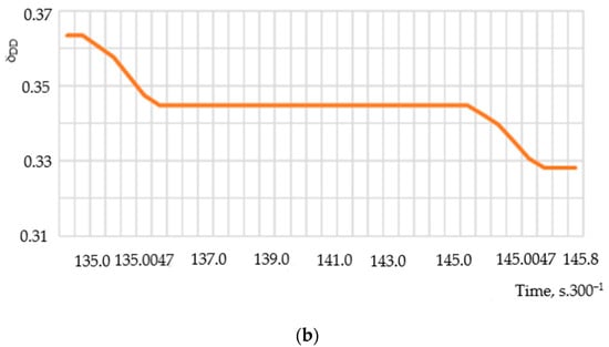 Figure 7a shows the dependence of the δφφ = Kφφ.σφ−2 standardized measurement error of the random phase of the DME signal on time t. Kφ φ is the posteriori dispersion of the measurement error of the random phase of the DME signal. Signal and noise parameters during simulations are determined by relation (27). The figure shows that after 0.45 s, the coefficient δφφ settles at a value of 0.44. In the gaps between the received pulses of the measurement signal, the coefficient δφφ increases. After receiving the measurement signal, the measurement results are corrected (see Figure 7b).