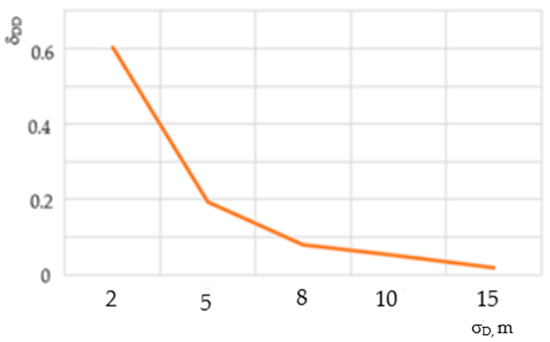 Figure 3 shows the dependence of the δDD standardized measurement error on the a priori dispersion σD. It is clear from the figure that as σD increases, the standardized coefficient δDD decreases. The simulation results confirmed that if the a priori dispersion σD varies from 2.0 m to 15.0 m, the δDD standardized measurement error varies from 0.6 to 0.02.