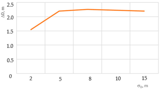 The dependence of the potential accuracy ΔD = (δDD.σ2D)0.5 on the a priori dispersion σD is shown in Figure 4. The simulation results show that increasing the a priori dispersion σD in the range from 2 to 15 does not cause a decrease in the potential accuracy ΔD. Therefore, we can confirm that the potential accuracy of the receiver basically does not depend on the a priori dispersion σD.