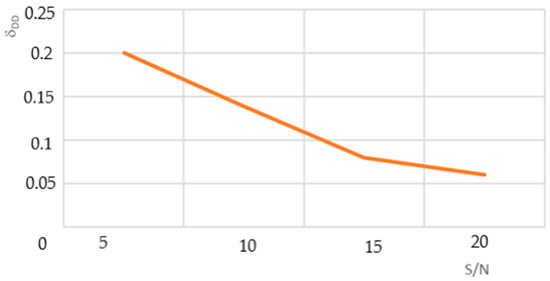 The dependence δDD of the standardized error of the slant range measurement D(t) between the FO and the DME on the useful signal-to-noise ratio S/N is shown in Figure 5. The figure shows that the standardized posterior dispersion δDD decreases as the S/N ratio increases. This fact indicates that the accuracy of the receiver improves as the S/N ratio increases. When the S/N is increased by 4 times, the δDD standardized measurement error decreased by 2.5 times.