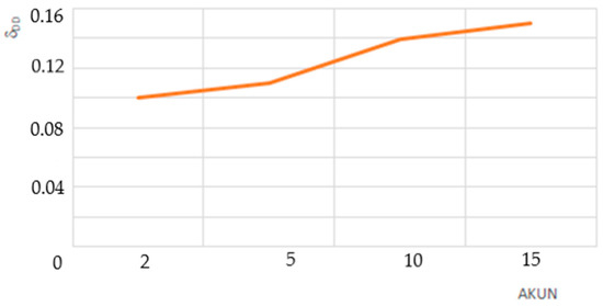 The dependence δDD of the standardized error of the slant range measurement D(t) between FO and DME on the interference power-to-noise ratio AKUN is shown in Figure 6. The figure shows that the normalized posterior dispersion δDD increases as the AKUN ratio increases. This fact indicates that the accuracy of the DME receiver deteriorates as the AKUN ratio increases.