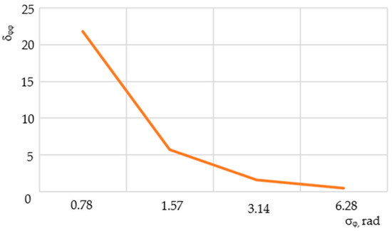The dependence of the standardized a posteriori dispersion of the random phase of the DME signal δφφ on the a priori dispersion σφ is shown in Figure 8. The simulation results confirmed that as the a priori dispersion of the random phase σφ increases by 8 times, the a posteriori dispersion δφφ decreases by 48.4 times. Increasing a posteriori dispersion σφ causes an increase in the measurement error of the phase of the measurement signal Δφ (see Figure 9).