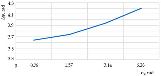 The dependence of the Δφ = (δφφ . σφ2) potential accuracy of measurement of the random phase of the DME signal on the a priori dispersion σφ is shown in Figure 9. The simulation results show that increasing the a priori dispersion σφ in the range from 0.78 to 6.28 causes a decrease in the potential accuracy of the Δφ the measurement from 3.65 to 4.2 rad. Therefore, we can confirm that the potential accuracy of measuring the random phase of the DME signal does not depend on the a priori dispersion σφ.
