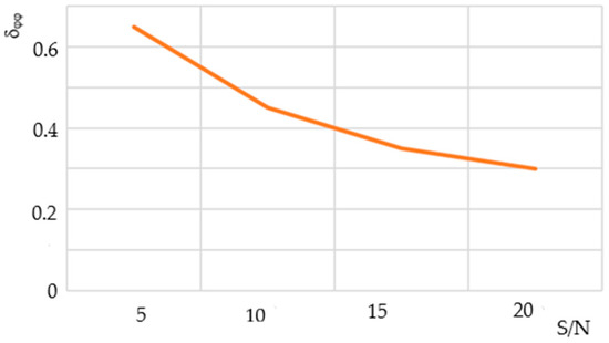 The dependence of the standardized posterior dispersion of the random phase of the DME signal δφφ on the ratio of the power of the useful signal to the noise S/N is shown in Figure 10. The figure shows that the normalized posterior dispersion δφφ decreases as the S/N ratio increases. This fact indicates that the accuracy of the random phase measurement improves as the S/N ratio increases. When the S/N increases by 4 times, the normalized posterior dispersion of the random phase δφφ decreases by 2.1 times.