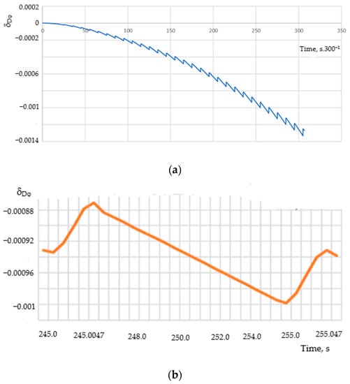 (a) Dependence of the δDD of the standardized measurement error of the slant range D(t) between FO and DME on time t. (b) Detailed dependence of the δDD of the standardized measurement error of the slant range D(t) between FO and DME on time t.