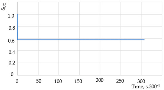 The dependence of the standardized posterior dispersion of narrowband interference δ2UC on time is shown in Figure 14. The simulation results show that the coefficient δ2UC settles at a value of 0.57 in a short time, which allows a good estimate of the interference at the input of the DME receiver. This is due to the presence of narrowband interference at the receiver input.