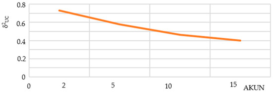 Figure 15 shows the dependency of the standardized posterior dispersion δ2UC on the ratio of the power of narrowband interference to the noise AKUN. When the AKUN ratio increases by 7.5 times, the normalized posterior dispersion δ2UC decreases by 1.8 times. It follows that as AKUN increases, the receiver can better identify narrowband interference and eliminate this interference from the additive mixture of useful signal and narrowband interference. Even so, higher AKUN values worsen the accuracy of measuring the navigation parameter D(t) (see Figure 17).