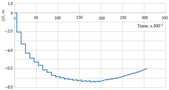 The dependence of the distance measurement error ΔD = D − D* of the DME receiver on time, for signal and interference parameters (27), is shown in Figure 16. D* is the measured value of the slant range D(t) between FO and DME, which was calculated according to Equation (21). The figure shows that the distance measurement error ΔD increases in the transition mode of the receiver. After 0.58 s, the distance measurement error ΔD decreases. In the transition mode, the mean value of the measurement error of the distance FO from DME D(t) is equal to −6.24 m, and the dispersion is equal to 2.1 m2.