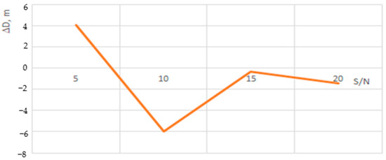The dependence of the distance measurement error ΔD on the S/N ratio is shown in Figure 17. The simulation time equals 1.0 s. The results of the simulation show that the accuracy of distance measurement by the DME receiver improves as the S/N ratio increases. If the S/N ratio varies from 5 to 20, then the distance measurement error ΔD varies from +4.0 m to −1.4 m.