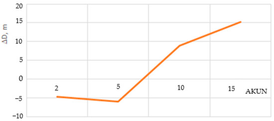 If the AKUN ratio changes ten times, then the distance measurement error ΔD increases four times. The simulation confirmed that the accuracy of the DME system deteriorates as the power of the narrowband interference increases. The results of the simulation, which was performed according to algorithms (21) and (22), showed that the accuracy of such a system would meet the current requirements for determining the position and navigation of flying objects using DME systems.