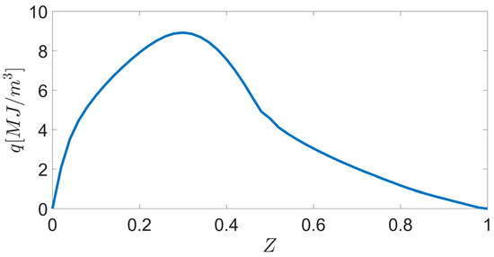 which implies a stoichiometric O/F of roughly 3, corresponding to . Besides the significant portion of carbon monoxide, additional particularities of combustion in the frame of space propulsion further entangle the equilibrium composition. Due to the high pressures and the absence of nitrogen, very high temperatures are reached in the flame (). Consequently, significant mass fractions of free radicals and hydroxyl are present at equilibrium. All of these substantial deviations from the assumption in (13) demand the redefinition of the stoichiometric condition. A reasonable criterion is to choose the O/F that maximizes the volumetric heat release. The integrated heat release rate is calculated as a function of the mixture fraction using Cantera [40] and a complex chemical mechanism [41]. The result is displayed in Figure 1. As can be seen, the mixture fraction that maximizes heat release takes place at values higher than the classical assumption of . More specifically, the maximum value is found at . This is in good agreement with the previous reasoning, since . Therefore, it can be expected that the redefined stoichiometric value is closer to the one in the assumption in Figure 1. Besides the graph in Figure 1, additional evidence for the better suitability of an as a stoichiometric value is provided in the discussion of the results.