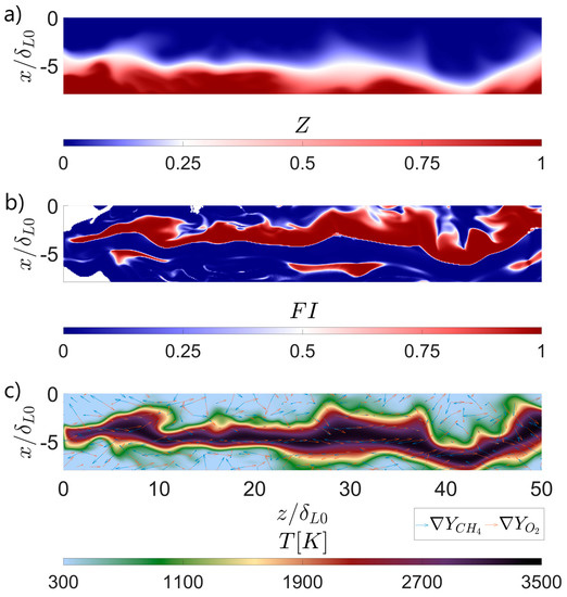 Example of instantaneous flame classification parameters in a reacting shear layer: mixture fraction (a), flame index (b), and temperature, unity fuel, and oxidizer gradients (c). Only the x and z components of the normalized gradients are displayed.