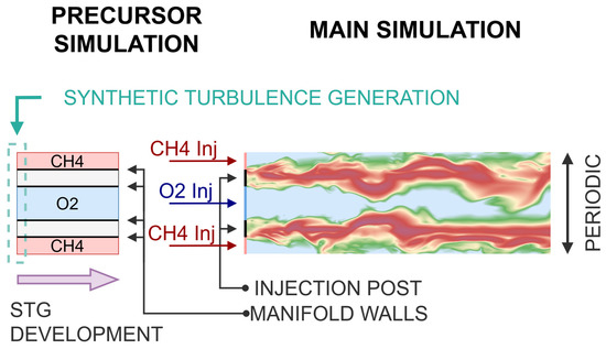 The inlet boundary conditions at the injection site in the main simulation are patched using the results of a precursor simulation. In this prior simulation, periodic synthetic turbulence is generated at the inlet via the procedure described in [68]. This scheme is derived from the original formulation proposed by Kraichnan and the subsequent improvements suggested by Shur et al. [69] and Morsbach et al. [70]. These methods are based on discretizing a reference turbulent kinetic energy spectrum in harmonics with random amplitude and phases. These waves are thereafter superposed to provide a synthetic velocity field that complies with the prescribed 2nd order turbulent statistics. The statistics were selected to resemble the output of RANS simulations for a scale methane rocket combustor discussed in a previous work [71]. The described simulation strategy is summarized in Figure 3.