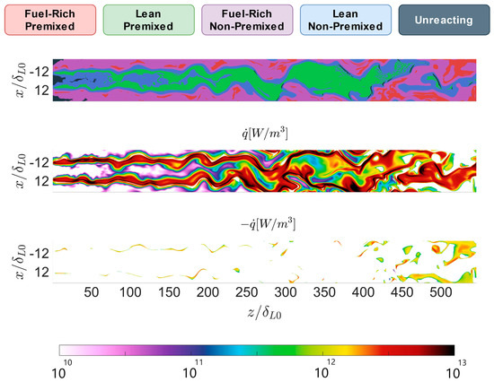 The Simulation is characterized by low inlet turbulence, with a flow behavior close to laminarity. An example of instantaneous flame development can be observed in Figure 4. In this illustration, the flame classification is displayed at the top, and both a positive and a negative heat release rate can be visualized at the center and bottom, respectively.