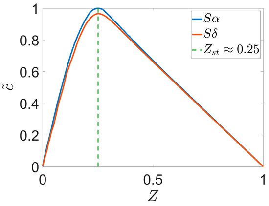 Despite the remarkably different flow characteristics, for both of the flames, the chemistry remains very fast compared to the turbulence. To prove this claim, the progress variable, as a function of the mixture fraction, is represented in Figure 8. As can be seen, both of the flames follow the trend expected for fast chemistry [33,37]. Flame displays a slight deviation, due to its higher turbulent kinetic energy, but the differences are negligible overall. The maximum value of the progress variable is obtained at , which further supports the discussed necessity to consider a shift in the stoichiometric value. The maximum variance of the progress variable conditional to is in the order of , corresponding to , while, for the rest of the domain, holds. Therefore, it can be assumed that combustion is limited by mixing, since, for a given mixture fraction, the corresponding progress variable is reached almost immediately. The turbulent timescales near injection can be used to examine the validity of the flamelet assumption as well. The mean turbulent timescale in this region is in the order of and for simulations and , respectively. Since the chemical timescale is in the order of 2 , it is evident that chemistry is significantly faster in both cases. These points are crucial for the interpretation of the results discussed in this section. Since the local heat release rate , which scales with , is essentially dependent on the mixture fraction dynamics. Therefore, the influence that turbulence exerts on the flame development occurs in terms of heat and mass transfer enhancements caused by forced convection.