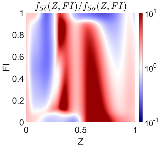 Figure 5 was elaborated to statistically summarize the observed processes. The right manifold can be used to investigate the probability of occurrence of the different classifications. Most of the observations take place in non-premixed conditions, ranging from moderately lean to significantly fuel rich. This is in good agreement with the example in Figure 4, where it can be observed that the non-premixed flamelet is predominant. There is a significant portion of data in the premixed conditions with extremely lean and fuel-rich mixtures. However, only the lean premixed regions deliver heat release rates in the same order of magnitude as the non-premixed flamelets. Intermediate flame indexes are rather unusual. This is due to the quasi-bimodal distribution of the flame index, which can be observed in the examples in Figure 2 and by other researchers [49]. These graphs provide valuable insights concerning the overall combustion process. However, it is important to remark on their strong dependency on geometry. For example, if the simulation domain were significantly longer, the statistics would shift toward equilibrium conditions. This would imply a greater concentration of points towards , with a lower averaged heat release rate.