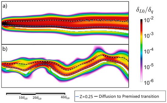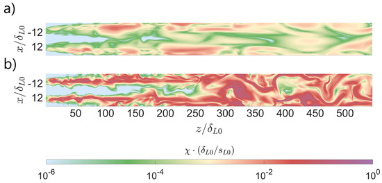 As expected, the scalar dissipation rate is greater in overall. This is caused by the larger turbulent kinetic energy at the inlet. The most remarkable difference between the simulations corresponds to the behavior following the merging of the shear layers. In Simulation , the mixing intensity decreases after the shear layers collapse. Contrarily, in , an increase in scalar dissipation follows the merging of the shear layers. This is motivated by the larger wrinkling of the shear layer, due to the integrated effects of the turbulence departing from the injection site. In , the shear layers are mostly aligned with the injection direction and, consequently, between themselves. Therefore, their merging produces little additional shear, and global dissipation dominates. Nevertheless, in , turbulence has enough energy to create substantial oscillations of the diffusive flame structures prior to their merging. In such a scenario, the collapse becomes more abrupt, enhancing the local mixing intensity. This phenomenon enables larger heat release rates, as premixed combustion becomes viable at the core, as displayed in Figure 12 for . If the scalar dissipation rate becomes too small, the possibility of combusting in a premixed condition in a stable way is disabled. This is evident in , but it can occur in localized regions in as well, as can be observed in Figure 6 and Figure 12.