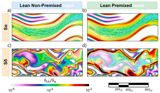 Details of normalized heat release right after the reactive shear layers merge: Simulation with a mask indicating lean non-premixed regions (a), Simulation with a mask indicating lean premixed regions (b), Simulation with a mask indicating lean non-premixed regions (c), and Simulation with a mask indicating lean premixed regions (d).