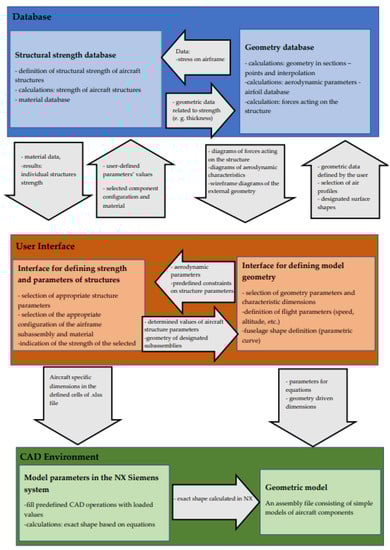 Among the available literature and materials, you can often find solutions in the field of creating models of aircraft structures along with simulations, especially in the context of MDO (multidisciplinary design optimisation) [24], e.g., in the field of CFD (computational fluid dynamics) flow analysis (usually on surface models) used for aerodynamic analyses of aircraft, including simulation of airflow around the wings, fuselage, propulsion, and other aircraft assemblies. This allows engineers to determine the effect of different configurations and shapes on the aircraft’s aerodynamic characteristics and solve problems related to aerodynamic stall and noise generation. In the case of the project in question, in addition to generating ready-made hybrid models (using surface and solid modelling) of given structures, the software allows for a preliminary strength analysis of the entire volume of the designed structures using analytical calculations, which are formulated based on the literature on aircraft design methods. The data and formulas are collected in a spreadsheet that serves as a knowledge base on which all calculations are based. Thus, the software allows for the direct generation of precalculated CAD models of aircraft, not only models created for CFD analysis, which, in the end, must usually be properly prepared for testing after the modelling stage, as described in the available sources.