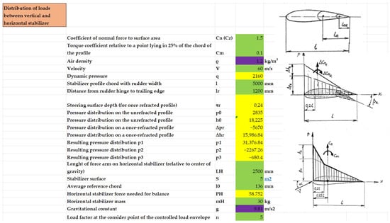 All calculations are carried out automatically in the Excel sheet tab dedicated to the given aircraft component using analytical methods (Figure 4). This is where the formulas are located and the necessary links between them and the user interface are set. Thus, when the user enters a given parameter, it is automatically loaded, and the strength of the component is calculated on its basis, taking into account predefined conditions containing aerodynamic parameters and aircraft flight conditions.