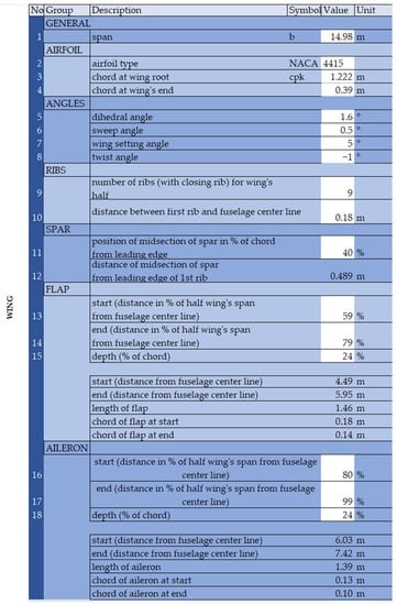 All dependencies and calculations result directly from the aforementioned literature on calculation methods used in the process of designing aircraft structures. There is a direct reference to the methodology of aircraft design, which is based on classic methods for designing these types of structures, which was transferred to the content of the database sheets. The procedures contained therein are very similar to the procedures used for designing aircraft described by other sources in the literature, e.g., those used in the book by D. Raymer [4]; thus, they do not require a detailed description of the used formulas due to the extensiveness and diversity of the entire content.